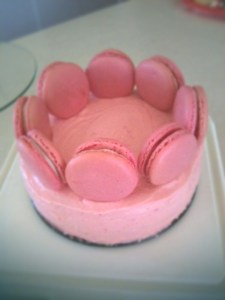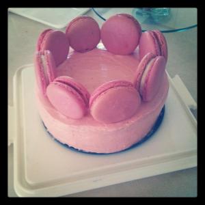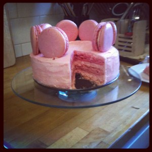 Having the macarons on top of the cake was an idea I had seen on raspberri cupcakes, too. The macarons also have a musky flavour to them, but instead of putting the buttercream icing in them, I decided on a vanilla bean cream. I just thought it would be way too much. The cream worked really well, as I didn’t add any extra sugar, just a tiny bit of vanilla bean paste so it wasn’t too sweet. It cut through the sweetness of the buttercream really nicely.