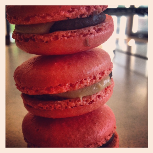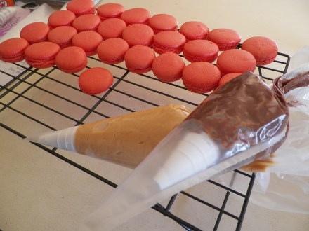 Like the above picture, place salted caramel and chocolate ganache in separate piping bags fitted with round nozzle. Pipe a circle of ganache on a shell, and fill the hole with salted caramel (it doesn’t really matter what order you do this in). Sandwich with other shell.