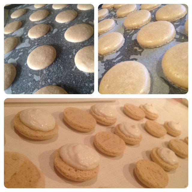 Begin beating the 50g egg whites with one hand, and with the other, stream the hot sugar syrup down the side of the bowl to create an italian meringue. Beat until stiff peaks form, the meringue should be thick and very glossy. If you want to add flavouring/colouring, now’s your moment. So add the colouring now. Just lightly beat them into the meringue. Pour meringue into the almond meal, icing sugar and 45g egg whites mixture and mix roughly to combine. When combined, fold mixture together (one single stroke) until there are no air bubbles left. Make a spread across the top of the mixture, and it should disappear in about 20 seconds. Spoon mixture into a piping bag fitted with a round nozzle. (If you don’t have a piping bag set, most supermarkets sell plastic ones, they are Multix brand, in an orange box and contain 5 piping bags with a few different nozzles, plus they’re only about $3. You should be able to find them in the baking aisle). Lock the bag by spinning the top around 4 times. Pipe 3-4cm rounds on the oven trays prepared earlier. Tap the bottom of the trays on the kitchen bench and let them sit for about half an hour, or until mixture is dry to the touch. Meanwhile, preheat the oven to 145c (135c fan forced).