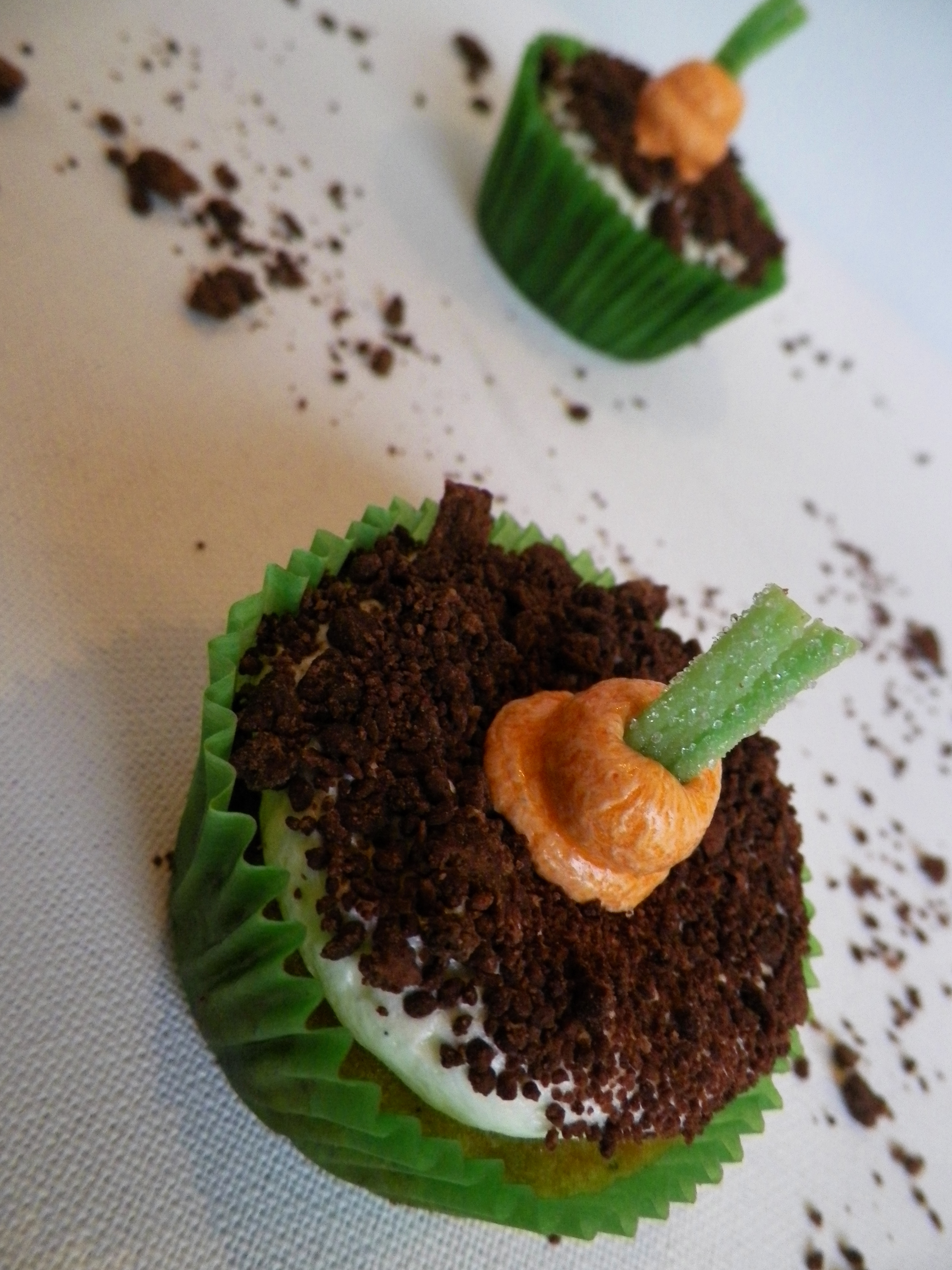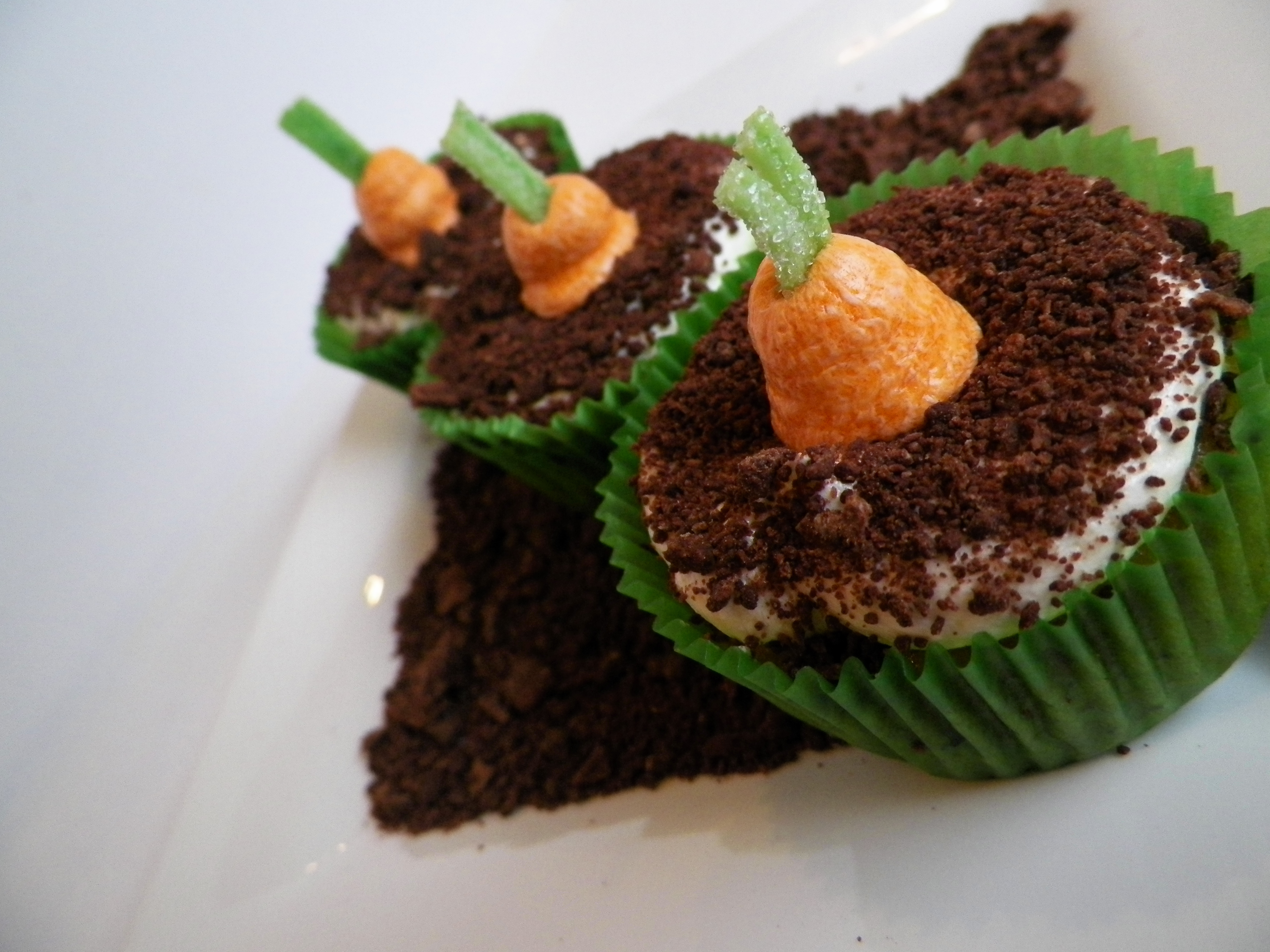 With a small sharp knife, carefully carve out a small circle in the top of the cupcakes, leaving a hole to pipe in the carrots. Place the icing in a piping bag fitted with a wide round nozzle, and pipe circles around the hole made in the cupcake. Dip iced cake in the chocolate soil. You can add more soil to the cupcake with your hands if dipping it doesn’t cover the icing enough. Once all the cupcakes have soil on them, place the orange icing in a piping bag fitted with a small round nozzle. Pipe ‘carrots’ into the holes in the cupcakes, piping up so that the icing is approximately 1-2cm above the top of the cupcake. For the tops of the carrots, I used the green part of a sour strap, cutting them with scissors, with an incision of the middle of the strap. Place it in the carrot, far enough that it will not fall over.