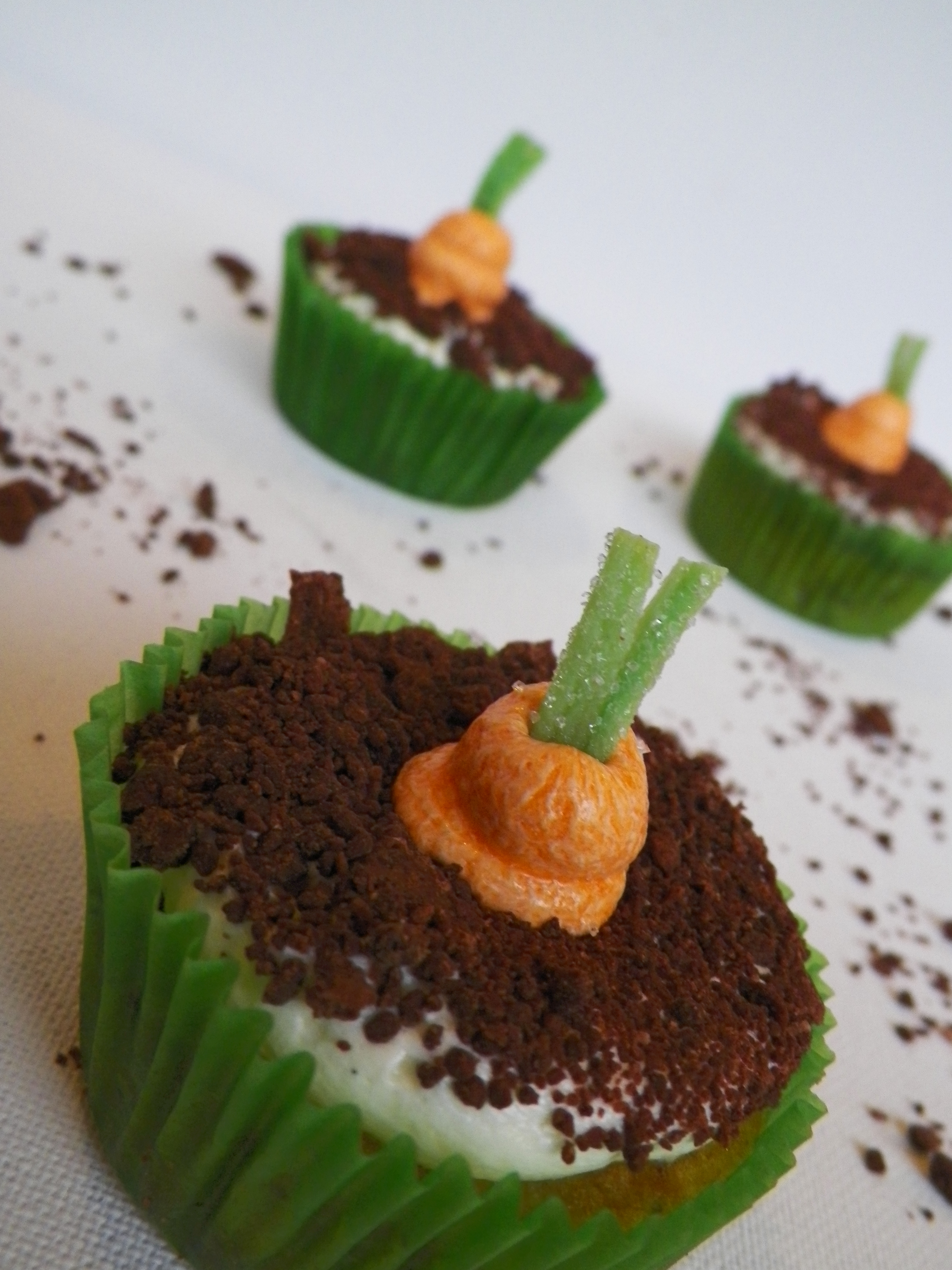 How is Easter almost here already?! It scares me how fast time flies these days, but hey, any excuse to bake, really. I found the idea for these awesome coming up carrot cupcakes on the ever-inspiring Pinterest. Unfortunately, I only saw them once and couldn’t find them again, so I don’t know whose idea they originally were, but they are pretty awesome.