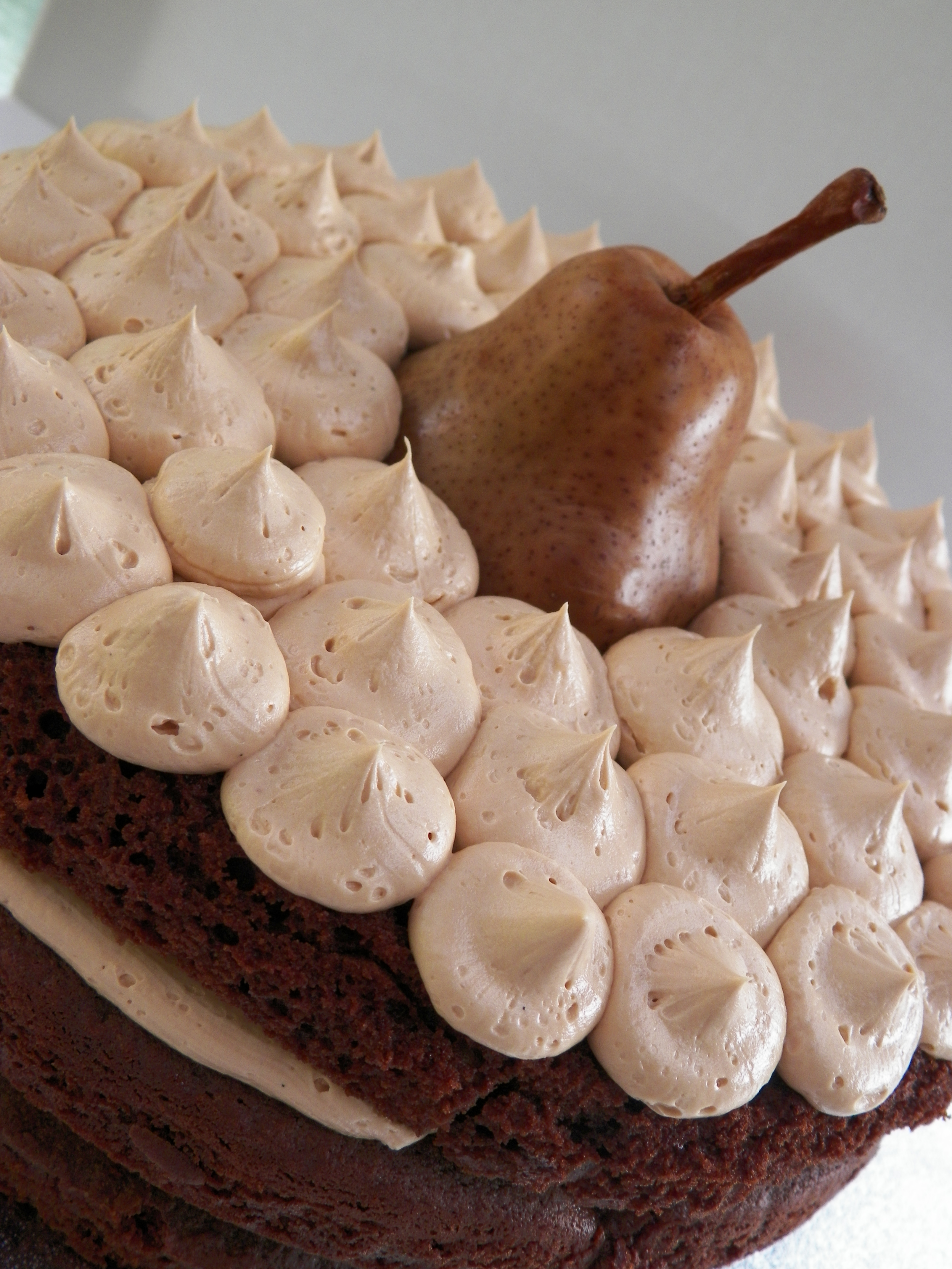 The recipes used here are nothing I haven’t made before, I’ve just adapted them a little differently. You can find the caramel buttercream recipe on this post for Caramel au buerre sale macarons, and you can find the chocolate cake recipe here – I have just made it into three round cakes instead of cupcakes. As for the pear, there is one pear, chopped, in each layer, plus the whole baked pear in the middle of the top layer. Enjoy!