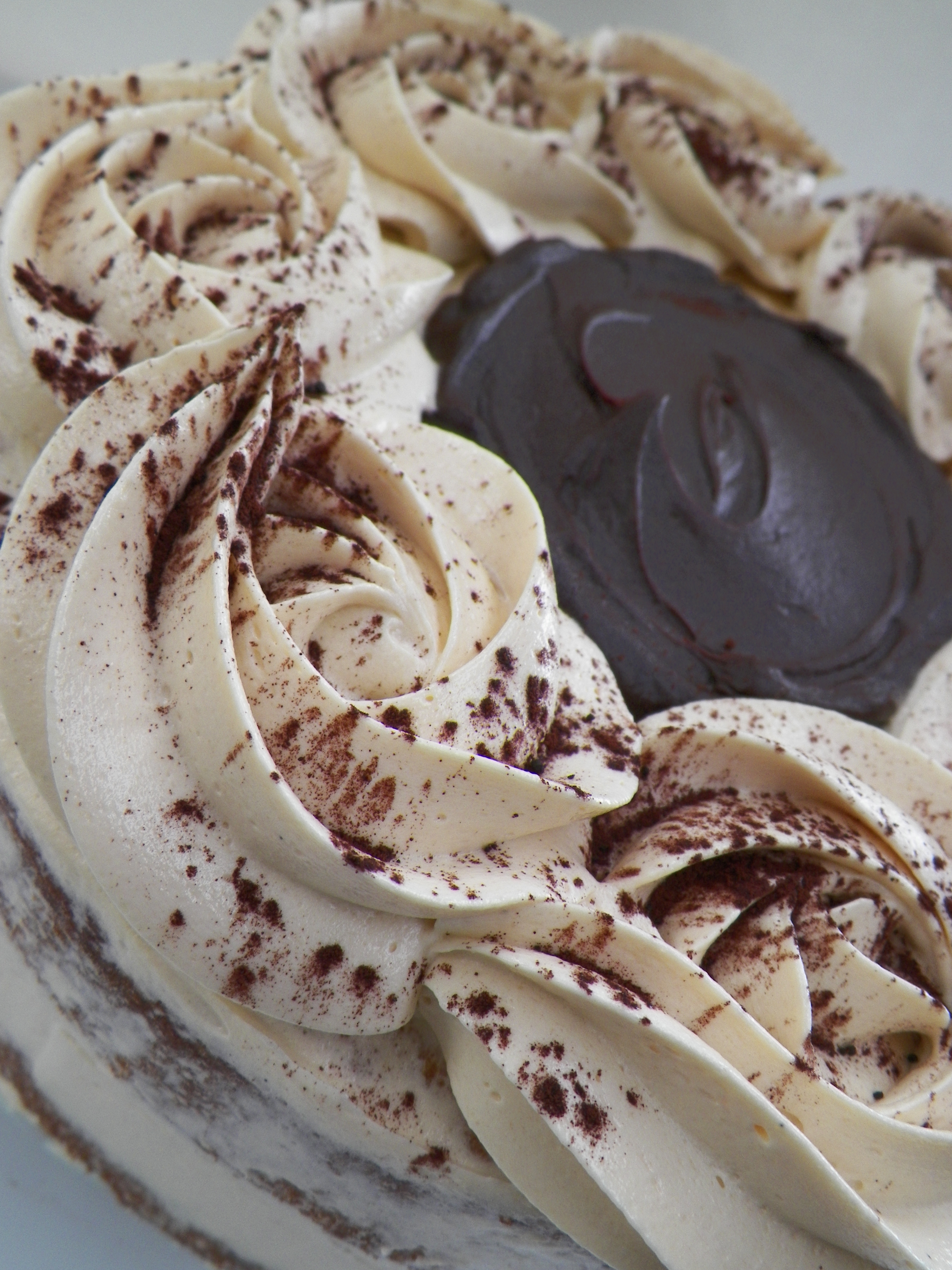 Place one vanilla cake on the stand or board which you will present on. Using a serrated bread knife, gently cut the top of the cake, horizontally, until you have created an even top. Using a palette knife or a spatula, generously spread approximately 2/3 cup of buttercream over the top of the first cake. Then, using a tablespoon, spoon approximately 2-3 tablespoons of dark chocolate ganache on top of the buttercream and push out toward the edges of the cake, taking care not to mix the two – you want the ganache on top of the buttercream. Place the second cake on top of the first, and again, gently cut across it to create an even top, and spread with the buttercream only. After this, using your palette knife or spatula again, gently coat the outside of the cake with buttercream, taking care to gently scrape the edges, creating a smooth, naked cake appearance. Then, place approximately 2 1/2 cups of buttercream into a large piping bag fitted with a large, star nozzle. Pipe rosettes or swirls around the edges of the cake, and lightly dust with cocoa powder. Spoon 1/2 cup of dark chocolate ganache into the middle of the cake, and gently spread out to the rosettes if you need to. As mentioned earlier, always bring cake down to room temperature to eat. Serve, and enjoy!