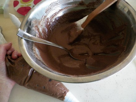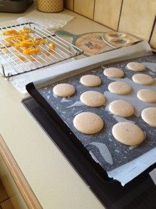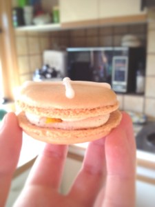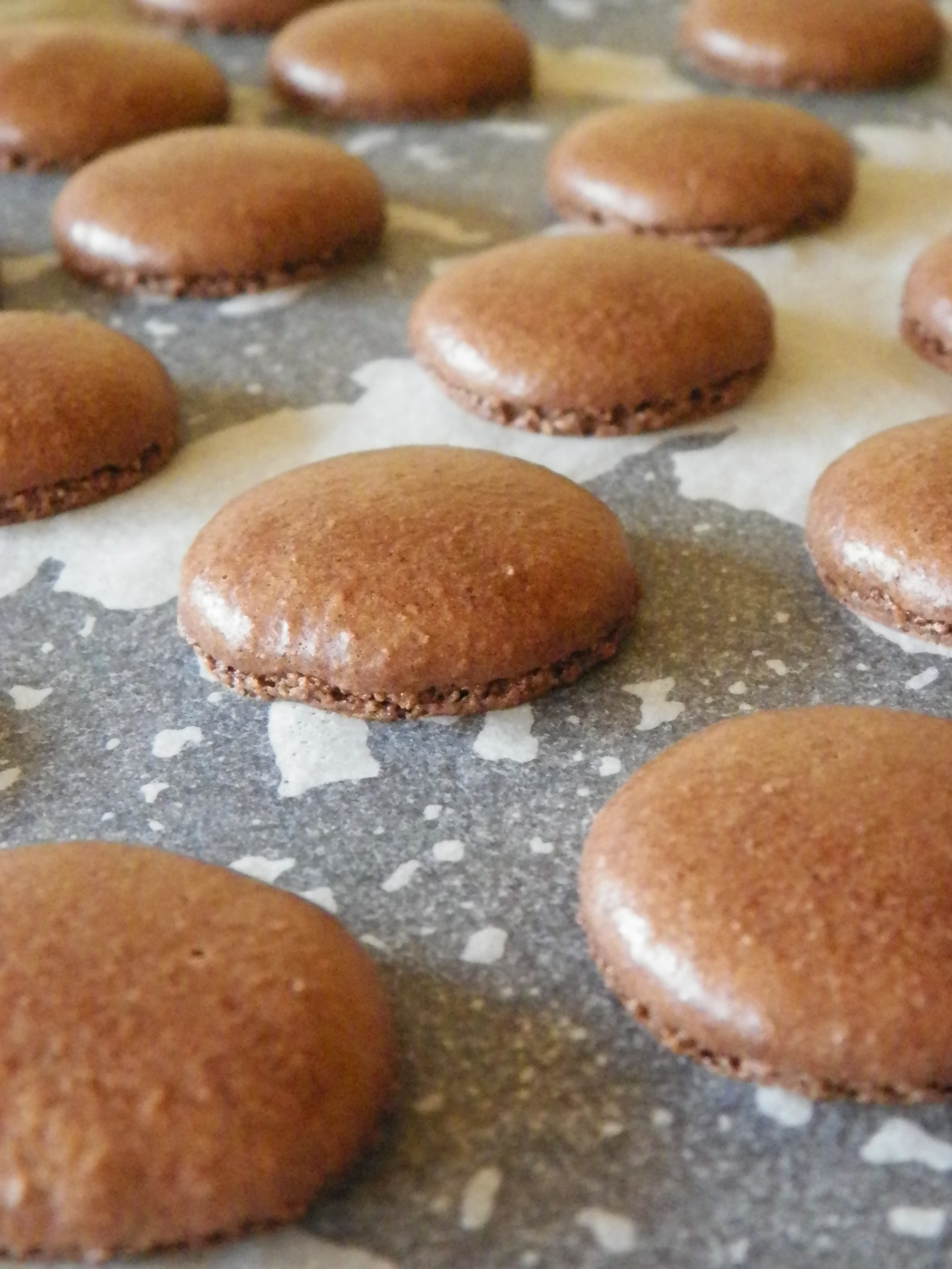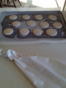 Begin beating the 50g egg whites with one hand, and with the other, stream the hot sugar syrup down the side of the bowl to create an italian meringue. Beat until stiff peaks form, the meringue should be thick and very glossy. If you want to add flavouring/colouring, now’s your moment. So add the colouring now. Just lightly beat them into the meringue. Pour meringue into the almond meal, icing sugar and 45g egg whites mixture and mix roughly to combine. When combined, fold mixture together (one single stroke) until there are no air bubbles left. Make a spread across the top of the mixture, and it should disappear in about 20 seconds. Spoon mixture into a piping bag fitted with a round nozzle. (If you don’t have a piping bag set, most supermarkets sell plastic ones, they are Multix brand, in an orange box and contain 5 piping bags with a few different nozzles, plus they’re only about $3. You should be able to find them in the baking aisle). Lock the bag by spinning the top around 4 times. Pipe 3-4cm rounds on the oven trays prepared earlier. Tap the bottom of the trays on the kitchen bench and let them sit for about half an hour, or until mixture is dry to the touch.