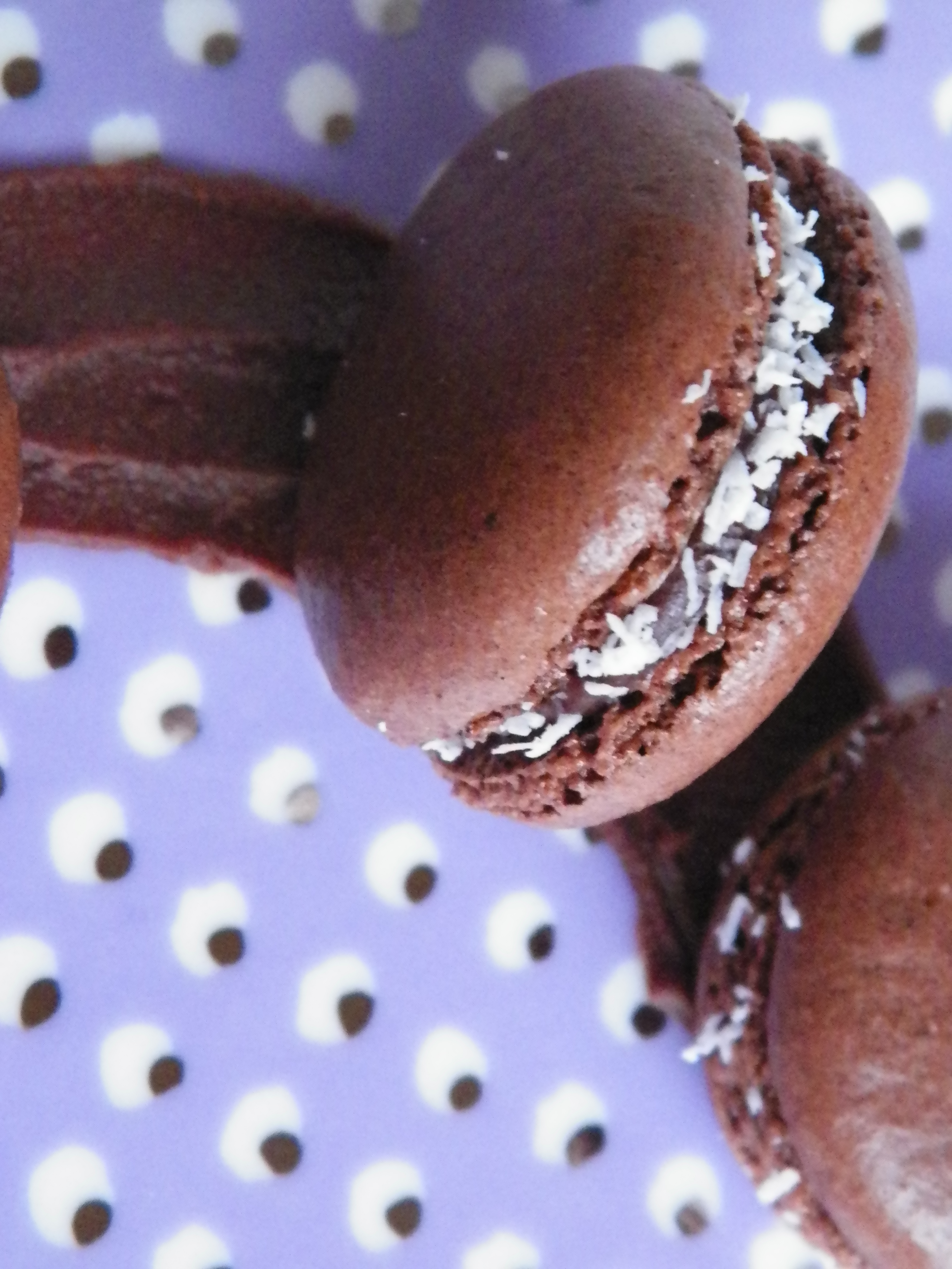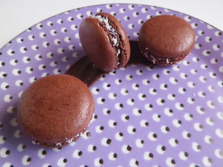 Place in oven and bake for 8 minutes. Turn tray around in the oven and bake for another 7 minutes. To test, pull a macaron off the baking paper. If it is stuck, keep cooking and checking regularly. Cool on trays for 5 minutes, then peel off and place on a wire rack. The mixture should make about 12 -15 large macarons, and about 25 smaller macarons. Macarons keep really well (about 5 days in the fridge) and some say that the longer they are refrigerated, the more the flavour is likely to develop. Macarons taste best when they are stored in the fridge, then brought down to room temperature to eat.