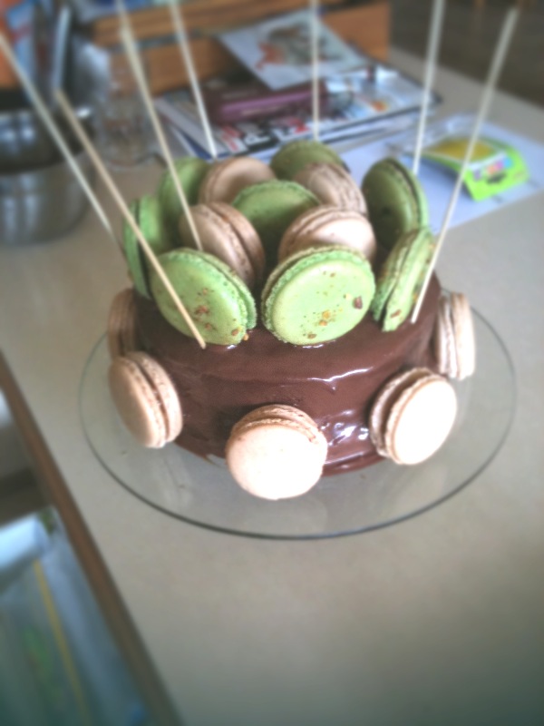Begin beating the 50g egg whites with one hand, and with the other, stream the hot sugar syrup down the side of the bowl to create an italian meringue. Beat until stiff peaks form, the meringue should be thick and very glossy. If you want to add colouring/flavouring, now’s your moment. Just lightly beat them into the meringue. Pour meringue into the almond meal, icing sugar and 45g egg whites mixture and mix roughly to combine. When combined, fold mixture together (one single stroke) until there are no air bubbles left. Make a spread across the top of the mixture, and it should disappear in about 20 seconds. Spoon mixture into a piping bag fitted with a round nozzle. (If you don’t have a piping bag set, most supermarkets sell plastic ones, they are Multix brand, in an orange box and contain 5 piping bags with a few different nozzles, plus they’re only about $5. You should be able to find them in the baking aisle :)). Lock the bag by spinning the top around 4 times. Pipe 4-5cm rounds on the oven trays prepared earlier(I usually make them smaller, about 3cm, but I thought bigger ones would look better on top of the cake). Gently tap the bottom of the trays and let them sit for about half an hour, or until mixture is dry to the touch.