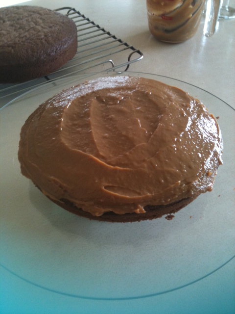 To assemble cake, begin with the lightest coloured cake. Sandwich together cakes with thick layers of icing, with either a spatula or a small rounded knife. Have a glass of warm water on hand to dip your knife into, as it makes it a lot easier to produce smooth icing.