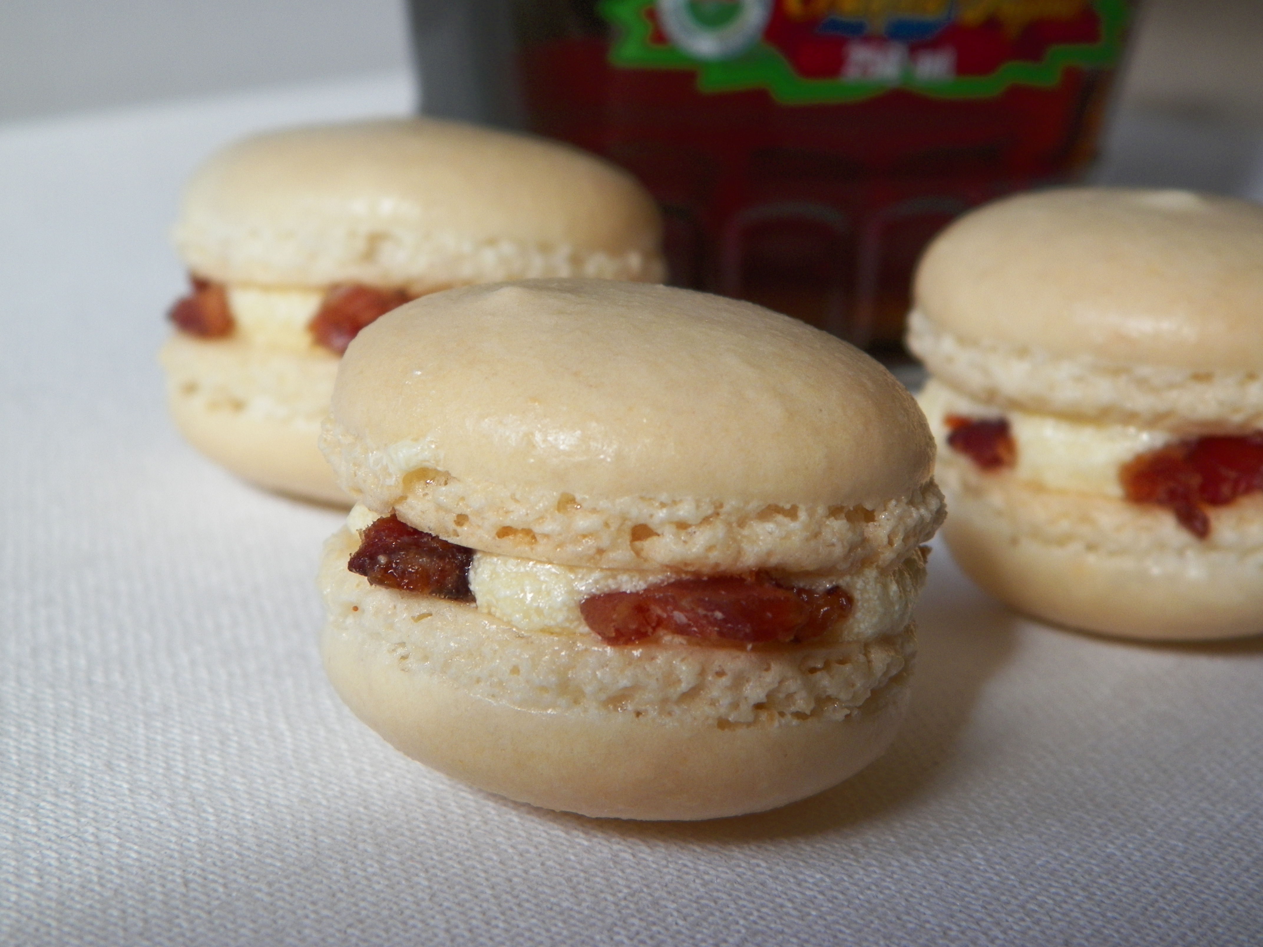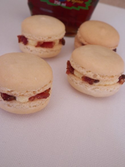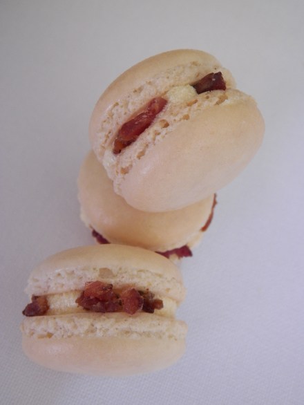 Match up likely pairs of macaron shells. Fill a piping bag fitted with a round nozzle, with the maple cream cheese icing. Pipe small rounds of icing on the macaron shells, place a non-chopped piece of bacon on top, and pipe a tiny bit more icing on top of the bacon. Sandwich with the other macaron shell, and place a few finely chopped pieces of bacon around the outside of the macaron. Place macarons in an airtight container. As aforementioned, macarons are best when they are stored in the fridge, then brought down to room temperature to eat.