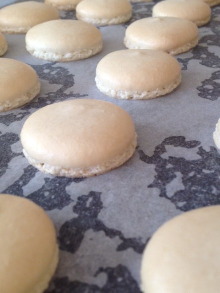 Begin beating the 50g egg whites with one hand, and with the other, stream the hot sugar syrup down the side of the bowl to create an italian meringue. Beat until stiff peaks form, the meringue should be thick and very glossy. If you want to add flavouring/colouring, now’s your moment. Just lightly beat them into the meringue. Pour meringue into the almond meal, icing sugar and 45g egg whites mixture and mix roughly to combine. When combined, fold mixture together (one single stroke) until there are no air bubbles left. Make a spread across the top of the mixture, and it should disappear in about 20 seconds. Spoon mixture into a piping bag fitted with a round nozzle. (If you don’t have a piping bag set, most supermarkets sell plastic ones, they are Multix brand, in an orange box and contain 5 piping bags with a few different nozzles, plus they’re only about $3. You should be able to find them in the baking aisle). Lock the bag by spinning the top around 4 times. Pipe 3-4cm rounds on the oven trays prepared earlier. Tap the bottom of the trays on the kitchen bench and let them sit for about half an hour, or until mixture is dry to the touch.